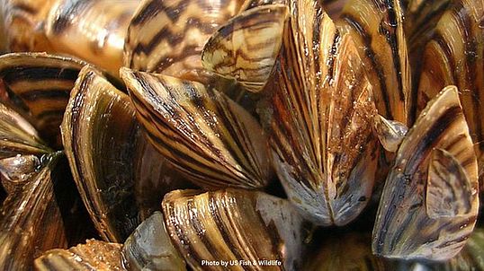 Quagga mussels (Dreissena bugensis) are small freshwater mollusks similar to zebra mussels in appearance and in their impact on aquatic systems. Introduced to the Great Lakes through ballast water via the St. Lawrence Seaway in the 1980s, they have since caused severe ecological damage in waterbodies in which they have invaded. They consume large portions of microscopic life that forms the base of the food web, alter water chemistry, and grow prolifically. Quagga mussels can colonize a range of substrates, capitalizing on soft surfaces like sand or silt that zebra mussels don't grow on--they outcompete zebra mussels in some waterbodies where they are both established. Learn more about invasive mussels here.
