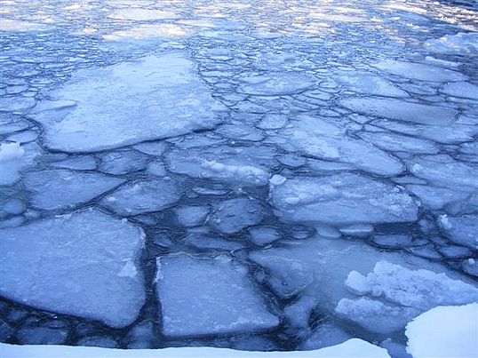 Lake water goes through many stages before finally becoming a thick sheet upon which we can skate or walk. Tiny needle-shaped crystals known as frazil form and orient randomly at the outset of freezing. As the frazil becomes more abundant, the crystals begin to coagulate. Under calm conditions they can form continuous sheets of thin transparent flexible ice known as nilas. This is the type of ice you might see as a skim on puddles after the first cold frosts of autumn. Nilas may grow to about 10 centimeters thick. After that, instead of growing vertically, water molecules begin to freeze on the bottom of the existing ice sheet increasing its thickness.