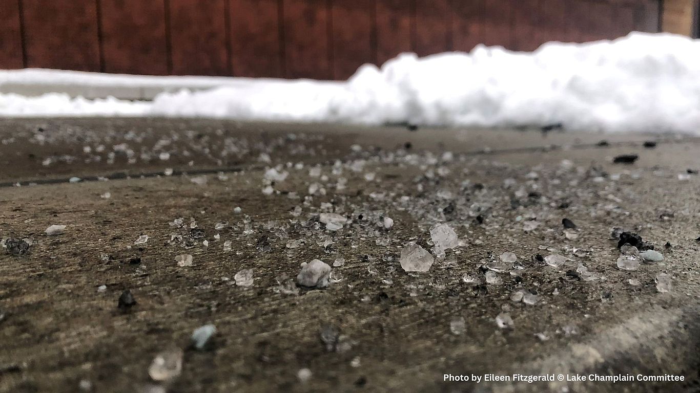 When salt in its typical NaCl form dissolves, the sodium and chloride separate into ions. “Those ions act kind of like referees in a hockey game” says Kris Stepenuck, Associate Director and Extension Program Leader for Lake Champlain Sea Grant. “The water molecules are trying to bond together to form an ice crystal, but the sodium and chloride get in-between the water molecules and they prevent those bonds from happening.” This lowers the freezing point of water and stops the formation of ice—though notably, the freezing point is lowered to 15 degrees F., making road salt effective only in conditions above that temperature. Salt’s ability to block the formation of ice in the right conditions is why it is applied annually on many roads, sidewalks, and parking lots, and why Lake Champlain and other waterways in cold regions around the world are getting saltier.