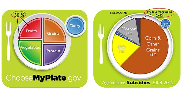 As an indication of the inefficiencies enshrined in the Farm Bill, consider the discrepancy between what the bill funds, and what regulatory agencies describe as a healthy diet. The USDA recommends half of food consumed should be fruits and vegetables to promote a healthy diet, yet less than one percent of farm subsidies promotes these foods. Eighty percent of benefits go to corn, grains and soy oil which is one reason why so much agricultural land has been given over to these annual crops which have such a destructive impact on water quality.