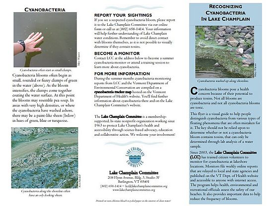 LCC has produced a visual guide to various types of floating phenomena on Lake Champlain. It will help you distinguish cyanobacteria from other common accumulations of plant matter. The key should not be relied upon to determine whether or not a blue-green algae bloom contains toxins.