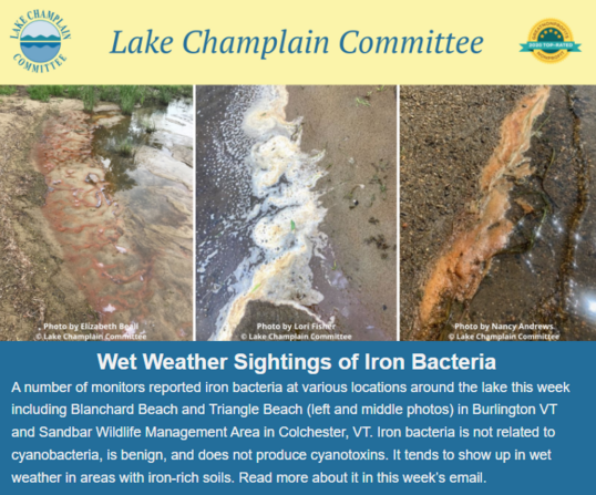 Happy Friday! Lots of green dots populated the cyanobacteria tracker this week and reports of clear water, non-filamentous green algae, and iron bacteria dominated over cyanobacteria in most areas. However, we did have cyanobacteria bloom reports from Lake Carmi and Lake Morey as well as Lake Champlain’s Inland Sea and high alert conditions at several St. Albans Bay sites as of today (8/20/21). Please keep a watchful eye on the water today as temperatures rise.