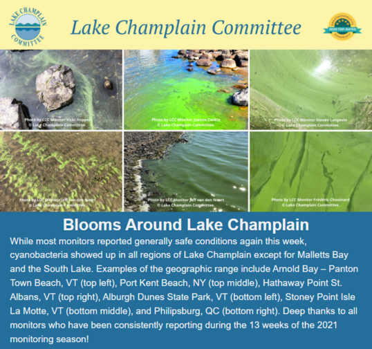 While most monitors continued to report generally safe conditions this week, we had bloom reports from some regions of Lake Champlain and Lake Memphremagog. You’ll find further details about this week’s reporting results via the links below. (Click on them to get to the information you want if you’re using a computer to view this email, scroll down through the email if you’re using a cell phone or Ipad.)