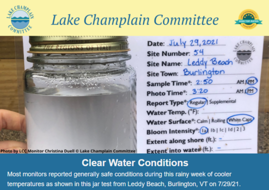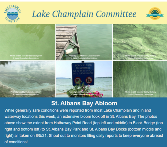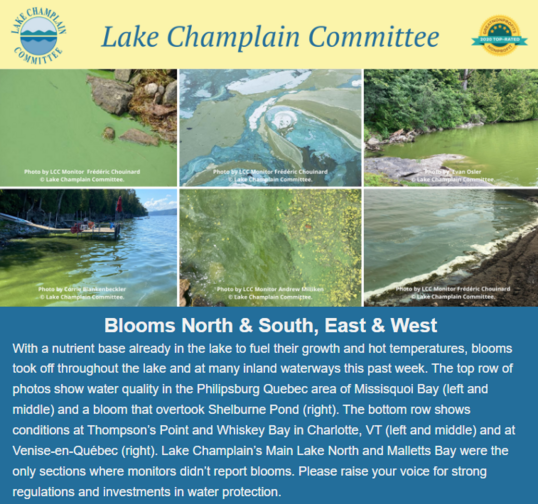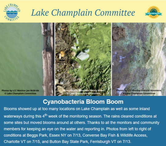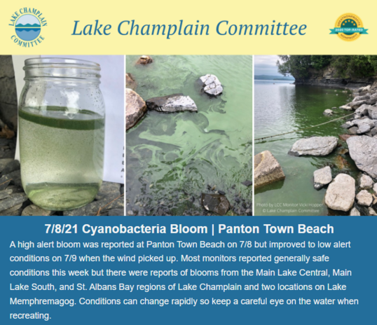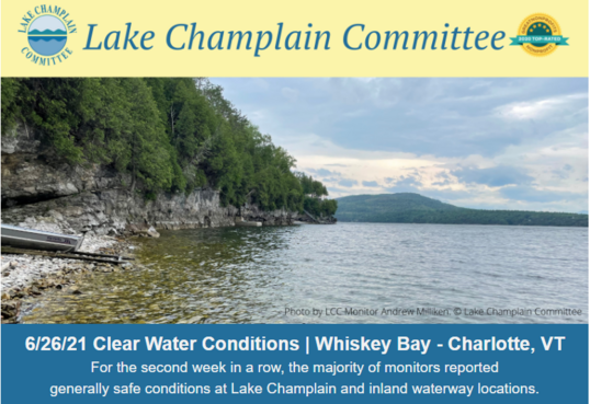 Happily water conditions improved significantly this week! Roughly 85% of the Lake Champlain reports and 94% of inland waterway reports showed generally safe conditions. Cyanobacteria sitings were restricted to Lake Champlain’s St. Albans Bay, Inland Sea, and Main Lake Central, along with Lake Carmi and Muckross Pond. The Week 6 compilation of results includes reports through 2:00 PM on Friday, July 30.