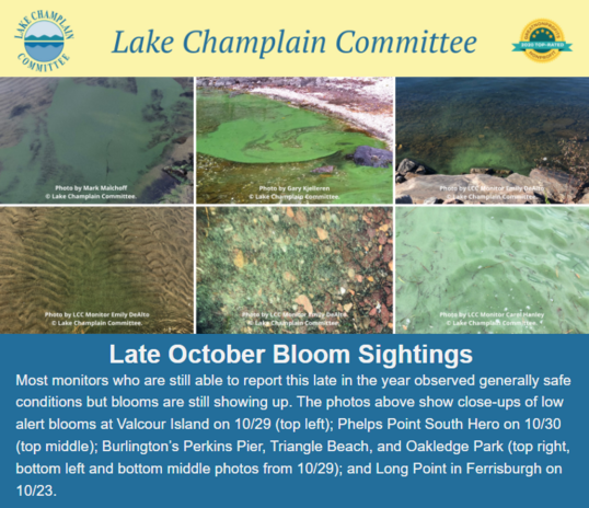 Thank you for your continued efforts during this 19th week of monitoring! We will close out the 2021 cyanobacteria monitoring season on November 7 but the cyanobacteria tracker and reporting forms will be available for several more weeks so please continue to report any blooms you witness. The Lake Champlain Committee (LCC) will send out our end of monitoring season email after November 7 in order to fully compile results from the final week.