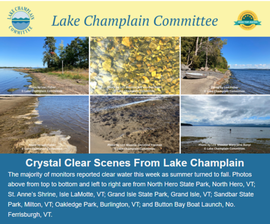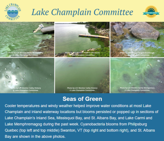 Windy, cooler weather helped improve water quality conditions during this eleventh week of monitoring. While generally safe conditions prevailed at most locations cyanobacteria was reported at Lake Champlain’s Inland Sea, Missisquoi Bay, and St. Albans Bay as well as Lake Carmi and Lake Memphremagog.