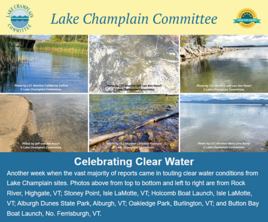 We had many clear water reports early in the week but conditions changed as the temperatures rose and the air stilled later in the week. A bloom took off in St. Albans Bay, and alert conditions were witnessed elsewhere on Lake Champlain, Lake Carmi, and Lake Memphremagog. Big thanks to everyone who is reporting regularly, and a special shout out to monitors checking on multiple sites and reporting daily. Your dedication and thoroughness have built this monitoring program into one of the most comprehensive community science cyanobacteria monitoring programs in North America. Yay team!