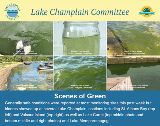 Generally safe conditions prevailed at most locations again this week but cyanobacteria was reported at Lake Champlain’s Main Lake Central, Main Lake South, Missisquoi Bay, St. Albans Bay, and South Lake and at Lake Carmi and Lake Memphremagog.