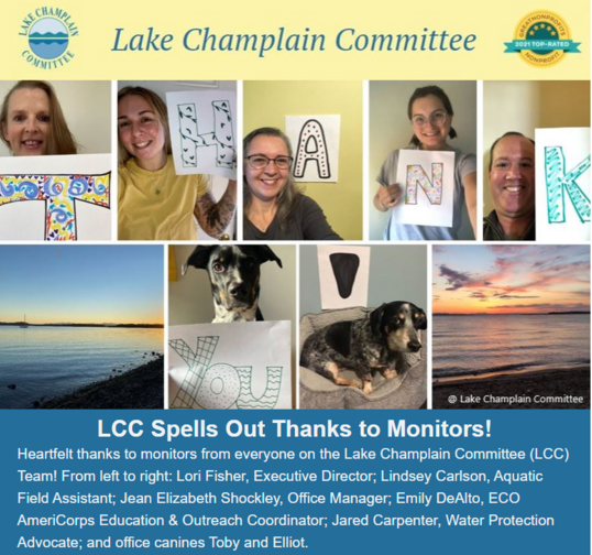 In sun and rain, heat and cold, monitors collectively filed over 2,700 reports during the 2021 season. In the links and photographs below you’ll find our last weekly report compilation for 2021; see a late season bloom at Arnold’s Bay; learn what a difference a day can make; view water samples of cyanobacteria and clear water conditions; witness beach beauty, autumn glow at Isle LaMotte, late season lake beauty, and a Lake Memphremagog sunset; and catch the LCC Team raising a glass as we close out the 2021 monitoring season.