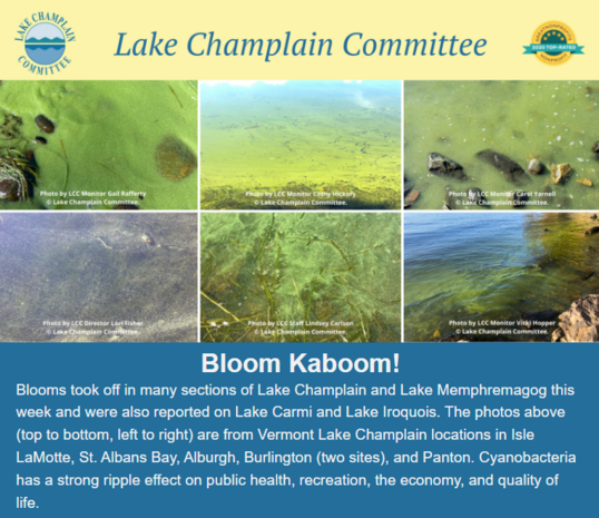 Monitors filed over 240 reports this past week as blooms popped up or persisted in numerous locations on Lake Champlain and several inland waterbodies. Lake Champlain’s Inland Sea, Main Lake Central, Main Lake South, Missisquoi Bay, South Lake, and St. Albans Bay all experienced blooms as did Chittenden Reservoir, Lake Carmi, Lake Iroquois, Lake Memphremagog, and Shelburne Pond. Thanks to everyone who has been filing reports this season—whether of clear water or high alert blooms.