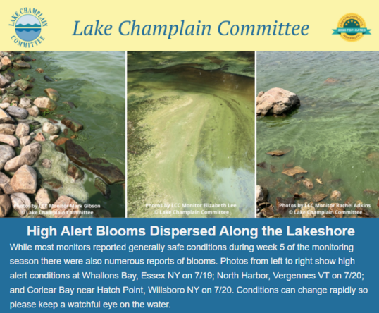 Another busy week of monitoring with variable conditions up and down Lake Champlain. While most monitors reported generally safe conditions at Lake Champlain and inland waterway monitoring sites, low and high alert blooms were in evidence too. Lake Champlain’s St. Albans Bay, Inland Sea, Malletts Bay, Main Lake North, Main Lake Central, and Main Lake South, along with Indian Brook Reservoir and Lake Carmi, all experienced cyanobacteria blooms. Some public beach locations ping ponged back and forth between opening and closing throughout the week. The Week 5 compilation of results includes reports through 2:15 PM on Friday, July 23. For those of you experiencing blooms at your sites, please file daily reports through the time the blooms dissipate if at all possible. That additional reporting helps us track how cyanobacteria respond over time and keeps people updated on conditions.