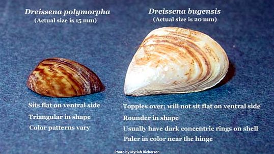 Quagga mussels (Dreissena bugensis) are small freshwater mollusks similar to zebra mussels in appearance and in their impact on aquatic systems. Introduced to the Great Lakes through ballast water via the St. Lawrence Seaway in the 1980s, they have since caused severe ecological damage in waterbodies in which they have invaded. They consume large portions of microscopic life that forms the base of the food web, alter water chemistry, and grow prolifically. Quagga mussels can colonize a range of substrates, capitalizing on soft surfaces like sand or silt that zebra mussels don't grow on--they outcompete zebra mussels in some waterbodies where they are both established. Learn more about invasive mussels here.