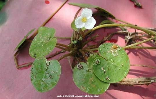 European frogbit (Hydrocharis morsus-renae) is a free‐floating aquatic plant with clusters of small, lily-like heart-shaped leaves. Frogbit does not anchor itself in the sediment but rather is moved around a waterbody by wind and wave action. As a result, the plant often ends up in quiet still waters, such as wetlands and coves. Plants are typically connected by a runner, which can create a dense surface mat. Mats of frogbit block light to submersed plants and crowd out native species, as well as inhibiting the movement of fish and ducks and impairing recreation.