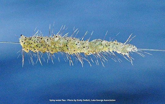 Spiny waterflea (Bythotrephes longimanus) was first discovered in Lake Champlain in 2014, and the similar fishhook waterflea (Cercopagis pengoi) came shortly thereafter in 2018. Both are native to Europe and Eurasia and have been present in the Great Lakes since the 1980s. Invasive waterfleas compete with native zooplankton and are difficult for small fish to ingest, thus a poorer food source. The long spines of these species can hook them onto anglers’ lines in the hundreds, making fishing difficult.