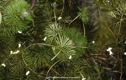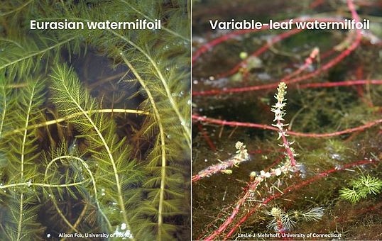 Eurasian watermilfoil (Myriophyllum spicatum) was first identified in St. Albans Bay in 1962 and has since spread throughout Lake Champlain. It reproduces almost exclusively by fragmentation—parts of the plant break off, drift, sink, develop roots, and grow into new plants. They can form canopies that block light, inhibiting the growth of native plants and reducing abundance and diversity of invertebrates. Dense populations of Eurasian watermilfoil pose a nuisance to swimmers and boaters. Wind and waves may break plants loose, and boating activity through dense watermilfoil beds also contributes to fragmentation and spread. The closely related AIS variable-leaf milfoil (Myriophyllum heterophyllum) was discovered in Missisquoi Bay and in the South Lake in 2009.