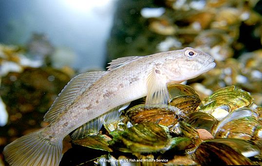 Round goby is a fish species native to the Caspian and Black Sea regions. First found in North America in the St. Clair River in 1990, they were likely introduced to the Great Lakes from a ship's discharged ballast water. Gobies are bottom-dwelling fish that perch on rocks and substrate. They grow up to 10 inches long and have large heads, soft bodies and dorsal fins that lack spines. Often confused with sculpins, the round goby is distinguished by its fused pelvic (bottom) fin which forms a suction disk that allows them to anchor to the bottom. No fish native to North America has this feature. Round gobies are predators of many native fish such as darters, sculpins, and logperch. Populations of some of these species have seen substantial declines in the St. Clair River. They also eat eggs and fry of lake trout and eggs of lake sturgeon. Round goby can harbor the bacterium that causes avian botulism; this is transmitted to the birds that eat them and has been implicated in major die-offs of birds in the Great Lakes.