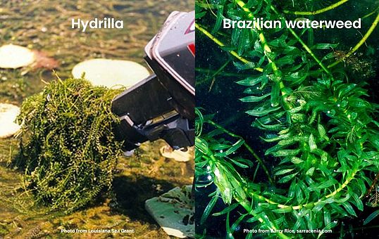 Hydrilla (Hydrilla verticillata) is is considered one of the most invasive species in the world. It was released from aquarium trade in Florida in the 1950s and has invaded many waterbodies since, including in New England and New York. Hydrilla has small leaves whorled around a simple stem, and tolerates a wide range of environmental conditions. It spreads primarily through fragmentation and can grow extremely aggressively once introduced. Brazilian waterweed (Egeria densa) is an AIS similar in appearance with populations in New York. It has a slightly narrower range of preferred environmental conditions than hydrilla but can also grow in dense stands. This guide from the Ausable Freshwater Center helps distinguish the species from each other and from native lookalikes.