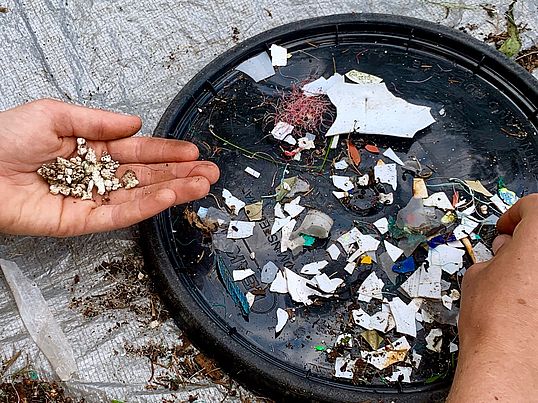 As larger plastics degrade, they form microplastics, very small particles of floating plastic that are difficult to see and challenging to remove once they enter the environment. Aquatic organisms may mistake microplastics for food, causing them to move through the food web, along with the chemicals they carry.