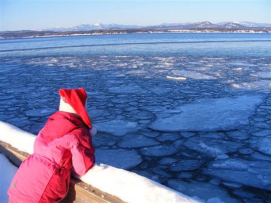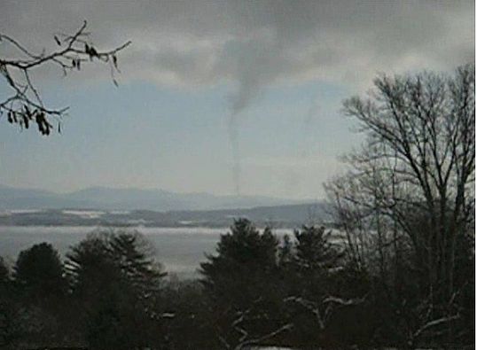 Throughout the winter, arctic air masses move in over Lake Champlain. Frequently, a layer of fog develops at the interface between air and water. At first the fog is formless, but then a few strands will be pulled upward in strings like cotton candy. The wisps of steam carry heat and moisture to the air above. Occasionally, some of these strings begin to spiral and become taller and tighter, stretching up above the fog layer. The thin tubes are typically only a few feet wide, but can get much larger. The tubes can reach up to a hundred feet into the air, like small tornados over the lake.