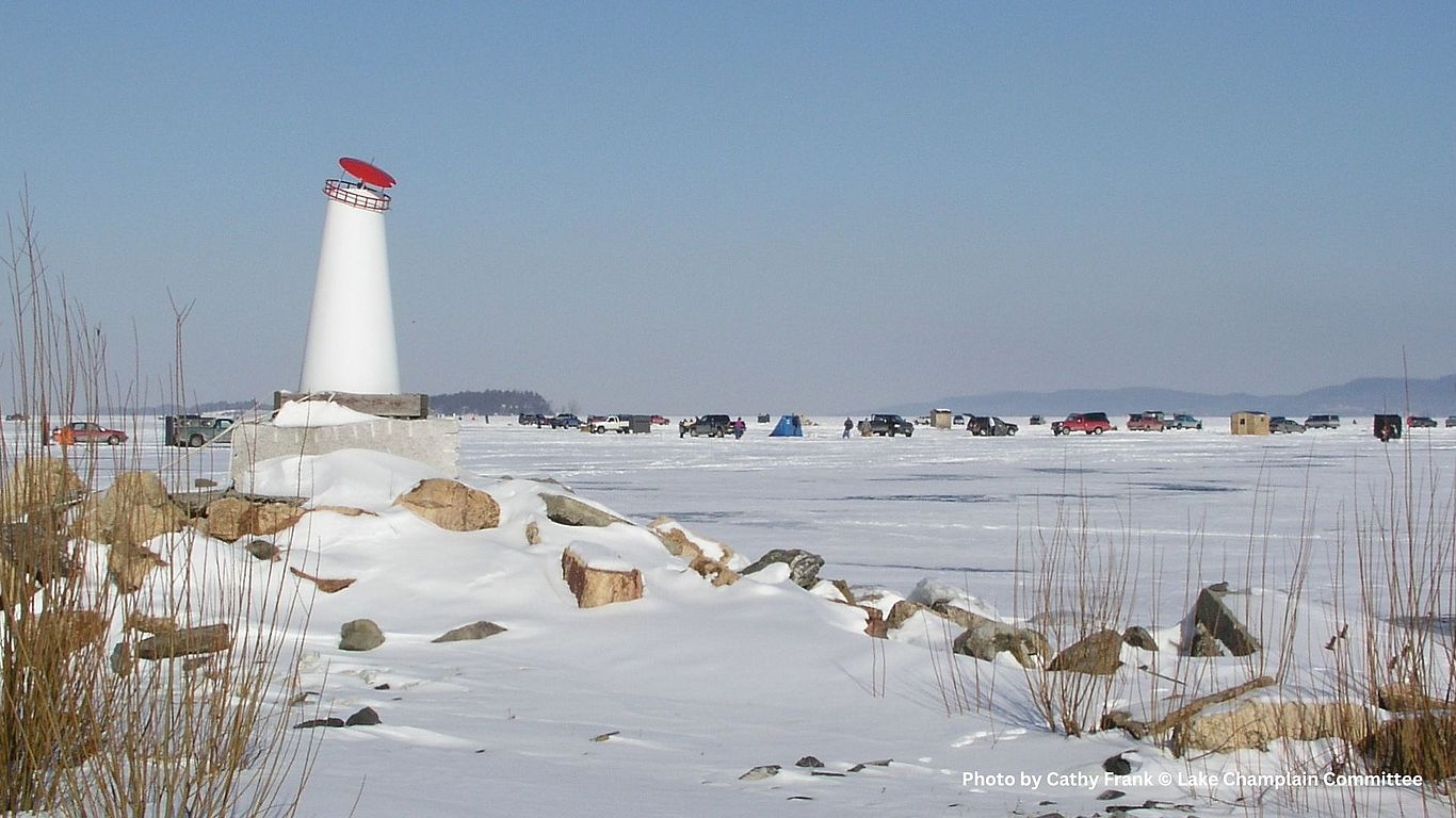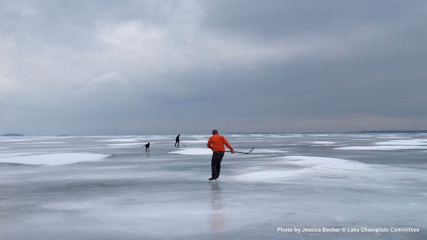 Ice, or the lack thereof, is perhaps the most dramatic visual we have for climate change in the Lake Champlain basin. This is not unique to Lake Champlain, but part of a trend observed worldwide. Warmer winter waters will pose a problem for cold-water fish species such as lake trout, which rely on the cold to open up a wider habitat range. It can also increase the frequency and duration of cyanobacteria blooms because cyanobacteria tend to like warmer waters. Non-lake dwellers like us once had a culture of ice, but our ability to live alongside and with swaths of frozen water is decreasing year by year. A sliver of hope given this melty trend is that climate change is a human-caused problem with human-driven solutions—it is up to us to slow down and adapt to our changing climate. We encourage readers to take time to appreciate the still, sometimes harsh, and increasingly rare beauty of a frozen Lake Champlain.