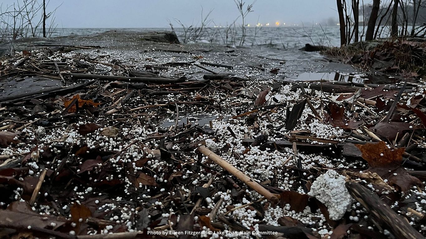 The Stone Age, the Bronze Age, and the Iron Age have come and gone, and some scientists say that we are now living in the Plastic Age. Relative to human history, plastic is new. It is a synthetic material invented in the 19th century and manufactured broadly only after World War II. Polystyrene is one of the most ubiquitous types of plastic. It is made with many connected monomers (molecules that can connect to themselves to form a chain) of styrene and is used in a host of products, often the single-use ones such as disposable cups and cutlery. Polystyrene can be manufactured in its expanded form as a foam called expanded polystyrene [EPS] foam, sometimes referred to as Styrofoam. EPS is inert, meaning that it does not react particularly well with either acidic or basic solutions. This characteristic makes it an effective and popular packaging material, but it also causes it to linger in the natural environment without biodegrading—no natural processes can completely break down polystyrene. Widespread use of EPS foam has had unintended and even existential impacts on the ecological function of waterways around the world, and Lake Champlain is no exception.