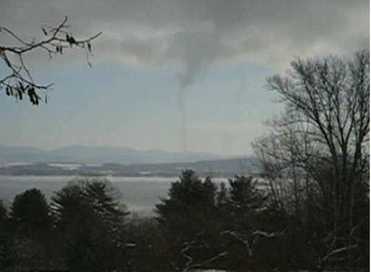 Throughout the winter arctic air masses move in over Lake Champlain. Frequently, a layer of fog develops at the interface between air and water. At first the fog is formless, but then a few strands will be pulled upward in strings like cotton candy. The wisps of steam carry heat and moisture to the air above. Occasionally, some of these strings begin to spiral and become taller and tighter, stretching up above the fog layer. The thin tubes are typically only a few feet wide, but can get much larger. The tubes can reach up to a hundred feet into the air, like small tornados over the lake.