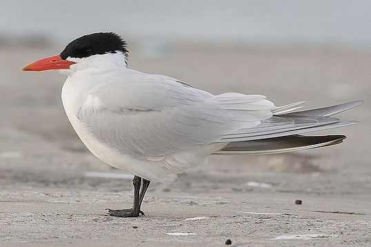 Caspian terns, the largest of the tern species, can be found throughout much of the world, but rarely in large numbers. In flight they are easily mistaken for more common gulls, but their behaviors and bright orange beak help distinguish them. While hunting, terns dive down on prey, un-like most gulls. They also hunt with their heads lowered to the water, a posture quite different from soaring gulls. Their voice, a raspy ‘kowk’ also differs from that of gulls.