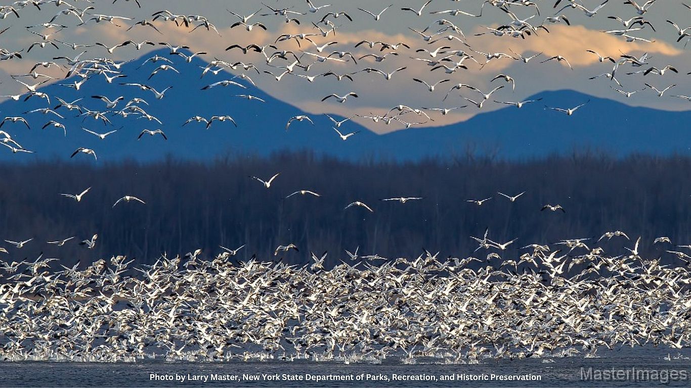 Lake Champlain is within the Atlantic Flyway, a major north-south flight path for migratory birds in North America. The lake and its wetlands, as well as our region's abundant farm fields, are like a comfortable traveler's inn for birds making a long journey, including snow geese. But with this year’s freeze-over, open water has been hard to find, resulting in even more circling and honking than usual as geese search for an inviting spot to land.