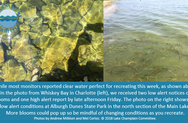 There was one report of low alert conditions in South Alburgh but that was short-lived and the water was clear the next morning. All other monitors reporting this week noted good conditions on Lake Champlain and other waterways in the program!