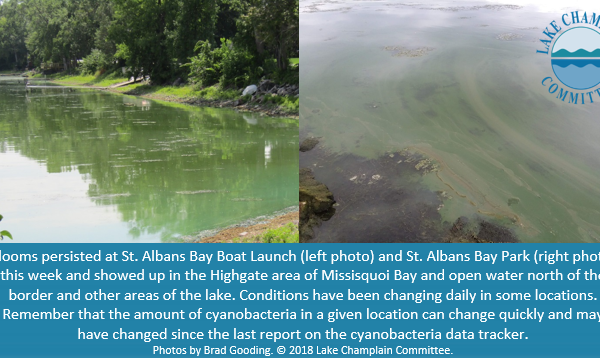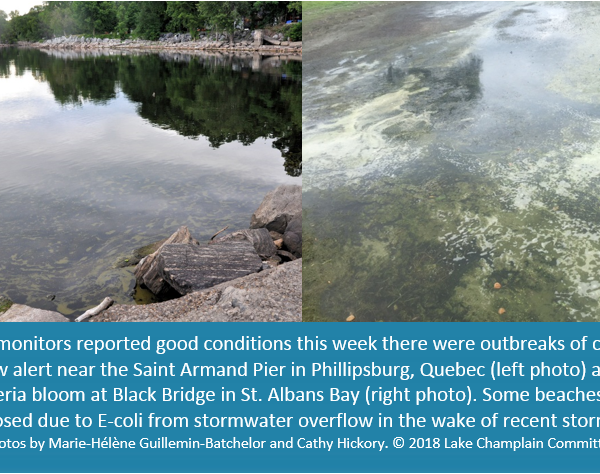 Mixed conditions were reported by Lake Champlain Committee (LCC) monitors again this week on Lake Champlain and inland lakes. Cyanobacteria blooms persisted in St. Albans Bay and Lake Carmi and in parts of Missisquoi Bay. Low alert conditions were…