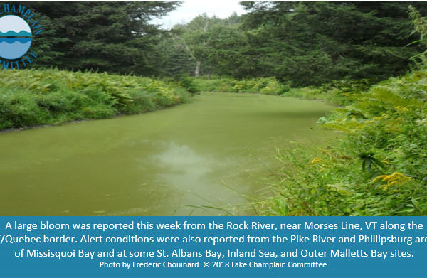 Yet another busy week of monitoring as alert level conditions were reported from several Lake Champlain locations and inland lakes. A large bloom was observed at the Rock River near Morses Line, Vermont on the VT/Quebec border and also in the Saxtons…