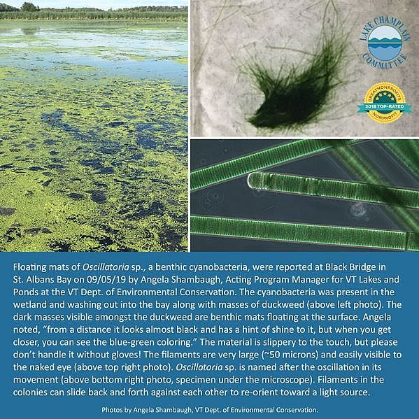 Mixed conditions were reported again this week on Lake Champlain in Missisquoi Bay, St. Albans Bay, and the Inland Sea, and also at Lake Carmi. The floating mats of the benthic cyanobacteria Oscillatoria sp. that we showed you pictures of last week…