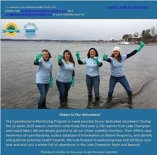 December 3 is Giving Tuesday, the "Black Friday" for charitable giving and part of an international movement to create a day of giving back. Please consider participating by making a gift of time or money to the Lake Champlain Committee.