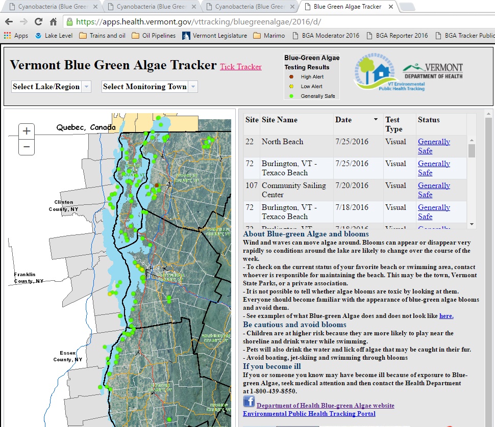 LCC has been working with VDH and the Vermont Department of Environmental Conservation (VT DEC) to expand the monitoring program and publicize results. The tracker is the most up-to-date source for vetted information on blue-green algae conditions and is accessible to anyone with an internet connection. Last year the tracker program was featured as a Center for Disease Control success story.