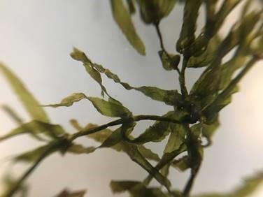 Hydrilla is a submerged, rooted perennial with stems up to 30 feet in length that branch at the surface and form dense mats. The plant looks similar to a native aquatic plant, Elodea canadensis, which is common in many New England lakes and rivers. However, hydrilla is different in that it has serrated or saw-toothed edges on the leaves and often has leaves in whorls around the stem with four to eight leaves per whorl. Leaves are bright green and about 5/8 inches long with usually reddish midribs with one or more sharp spines. The plant has small, white to yellowish, potato-like tubers attached to the roots.
