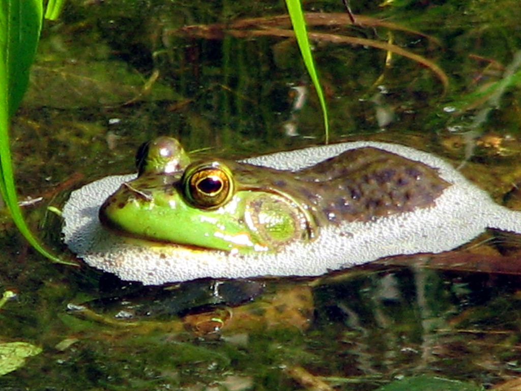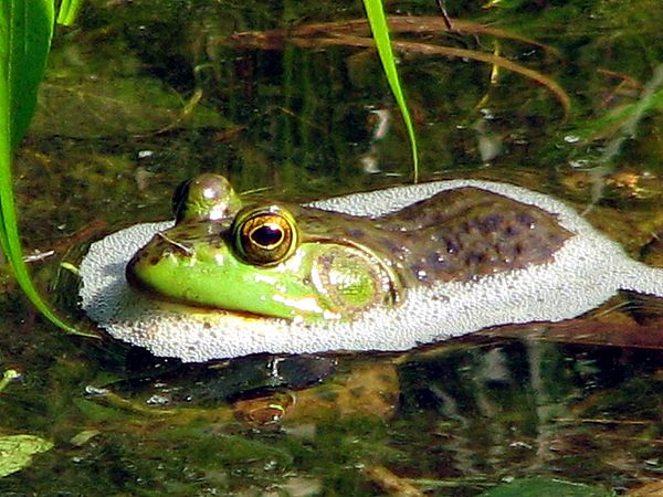 In early July gray tree frogs can still be heard calling for mates, but by the end of the month bullfrog (jug-o-rum) and green frog (like a single tong from a banjo string) calls become more prominent. Tree frogs breed earlier in the season because they utilize vernal pools for laying eggs. The advantage of vernal pools is that they hold fewer predators. The disadvantage is that the eggs must hatch and the tadpoles mature before the pools dry up. In contrast bullfrog and green frog tadpoles breed in permanent bodies of water. Their tadpoles will spend at least one winter in the water before maturing.