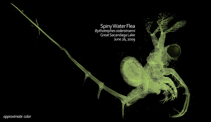 Spiny waterfleas were first found in North America in 1982 in Lake Ontario. Since then they have spread throughout the Great Lakes and a number of inland water bodies. They reached the Great Sacandaga Lake on the western edge of the Adirondacks by 2008 and Lake George in the Lake Champlain watershed by 2012.