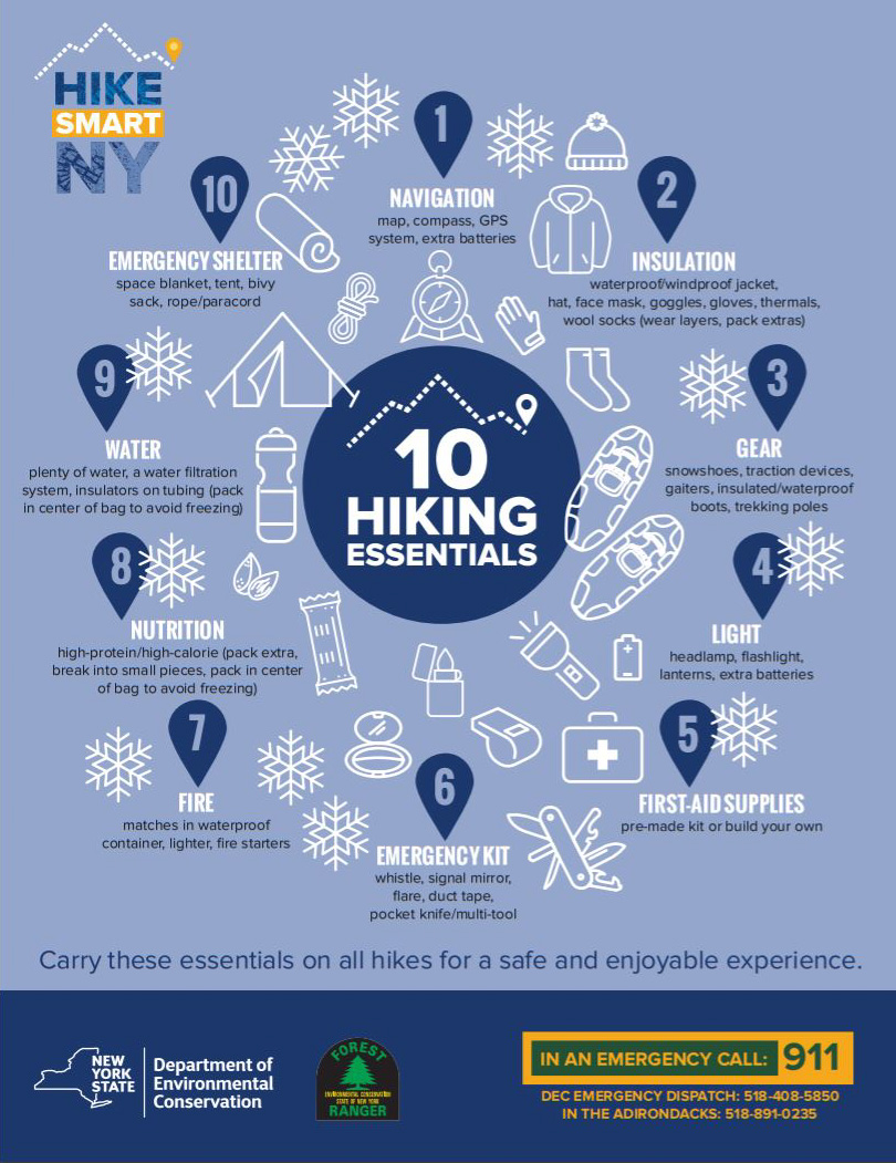 Be Prepared – Plan for cold, wind, ice, deep snow, and varying temperatures as conditions can change quickly. Carry enough food and water, appropriate gear (wind and water protective layers and traction devices), extra warm clothing, and a non-cell phone light source with extra batteries to be self-sufficient for an extended period of time and prepared for a backcountry emergency. Check out NY DEC’s Winter Hiking Safety Tips to guide your packing and prep before leaving home.