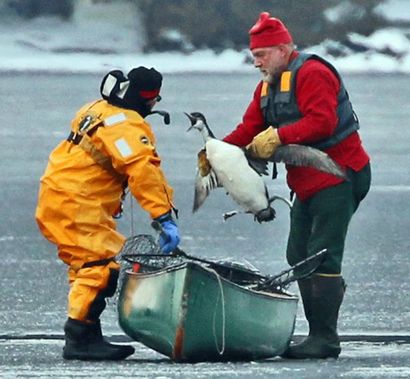 The Biodiversity Research Institute's Adirondack Center for Loon Conservation conducted five rescues of trapped loons in the first week of January alone, according to the Lake Placid News. Rescues were needed for three birds that got trapped in freezing lakes, a young bird that accidentally landed on a road mistaking it for a river, and a bird that had been ensnared by fishing line during the summer. One of the birds trapped in an icy lake was in the process of molting and unable to fly; the other two lacked sufficient open water to take-off. The birds trapped in freezing lakes were released in Lake Champlain.