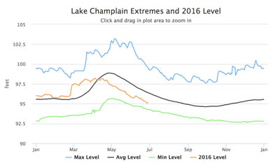 Lake Champlain remains about a foot below its average level for this time of year. The lake has been low all year and the current level is a result of a steady downward trend. Low lake levels present a hazard to navigation. Rocks and reefs usually covered by water lie just below the surface. Boats have trouble using some launches where levels are too low. Weed growth might be thicker in areas where sunlight reaches the bottom in places it wouldn't penetrate at typical lake levels.