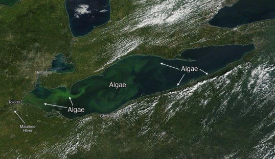 This year's blue-green algae bloom on Lake Erie was the largest ever, surpassing the massive bloom of 2011, according to the National Oceanic and Atmospheric Administration (NOAA). Scum from the bloom covered over 300 square miles at its peak in mid-August. Late spring and early summer rains helped drive the bloom. The Maumee River, the main source of nutrient loading to Lake Erie, experienced record discharge levels in June, and discharges remained high into July. Scientists grade the severity of blooms on a scale from one to ten, but this year's bloom scored a 10.5, surpassing early season predictions of its extent.