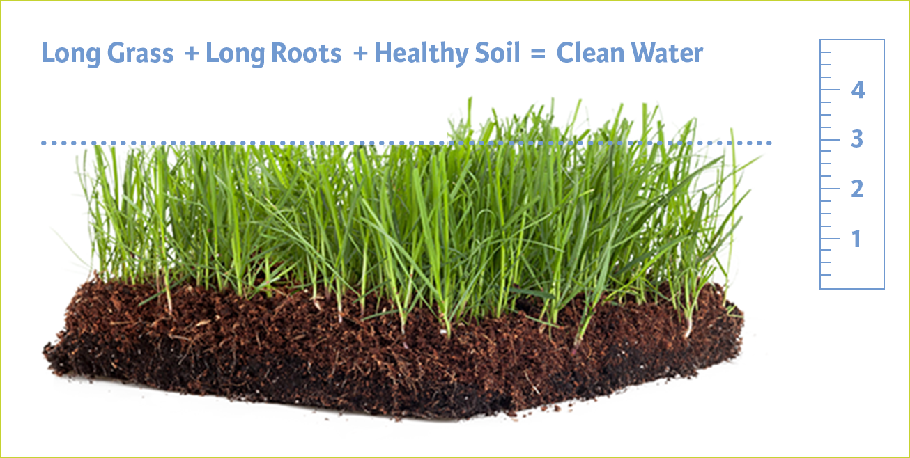 Longer grass and aerated soil capture rainwater that has picked up pollutants on the ground. As the water soaks in, nutrients and other forms of pollution are filtered by the soil. This cleanses the water that soaks in and reduces stormwater runoff from the surface, helping to make our waterways cleaner. Not only does the simple act of raising the blade improve water quality, but it also facilitates a lusher, more drought-resistant lawn, with slightly longer grasses shading out weeds.