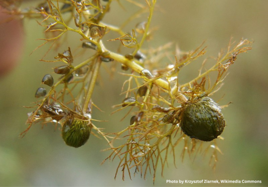 Rhizomes and tubers are both common in the terrestrial plants from which the aquatic plants we’re familiar with evolved—think of grass rhizomes and sweet potato tubers. One structure that is an adaptation specifically for aquatic plants is the turion. Turions are storage organs like tubers but are formed from buds rather than rhizomes. They are different from regular buds because they are nearly leafed out, but instead of expanding, they remain in a tight globule of dense plant mass, from which no stem has elongated. Bladderworts (Utricularia spp.), the fastest carnivorous plant in the world, develop these structures for winter. The high density of the turion causes them to sink. Only bladderworts in cold climes form turions. Some duckweed species (Lemna spp.), Watermilfoil (Myrophyllum spp.)--the most common and well-known of which are the invasive Eurasian watermilfoil, but there are several native species in the lake as well--and pondweeds (Potomageton spp.) also produce turions.